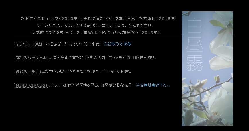 10周年記念誌「耽読魔酔」(P25)に記載した「夜をとりまく世界」その中に「百目鬼百穴」という場所が有ったと思いますが、それのエピソードを含んでおります。
