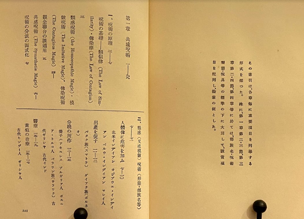 「金枝篇」の三~六章をベースに翻訳した国内発書籍、金枝篇に先駆け発行された様子。索引が大変分かり易く、使い勝手が良い。様々な例が事細かに分類されているので、資料としては充分(イメージが掴み易い為、作品テーマに呪術が絡む際は気分転換に読む)
