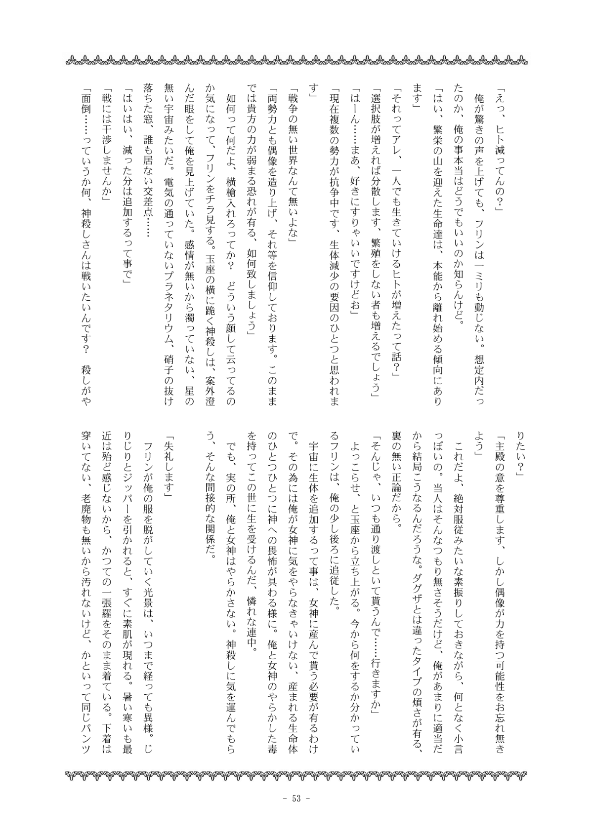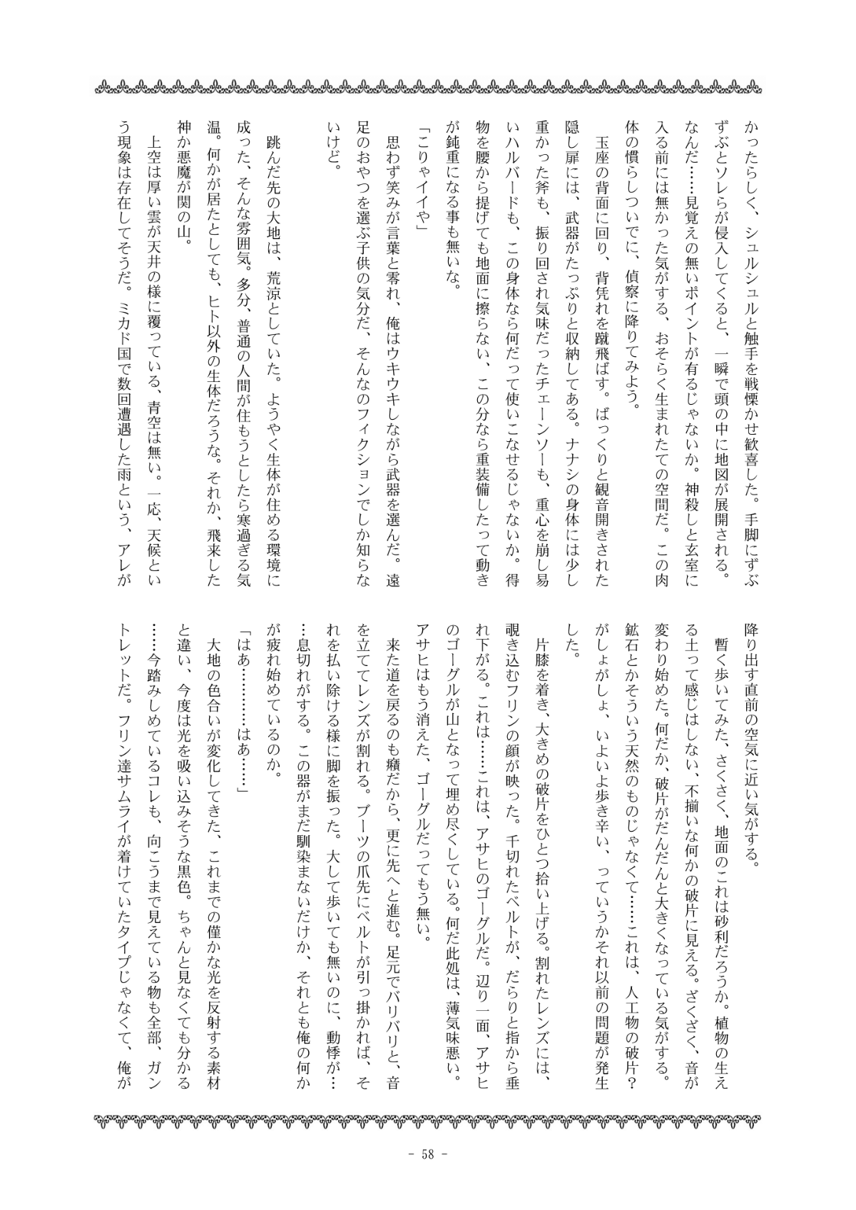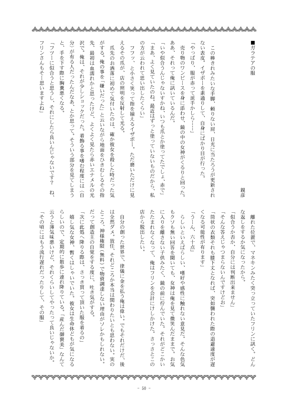 自分が寄稿した「ガラテアの服(小説・挿絵)」のサンプルを以下に掲載します。ページ画像1枚ずつです(汎用性考えバラにしてあります、すいません)