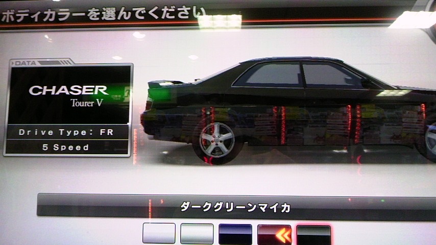 なんと、純粋なブラックは無く、ほぼ黒に見えるのはグリーンマイカというカラー。2004年頃の選択可能カラーを把握しておらず、意外な落とし穴。そして一応夜が選んだのと同じ「新環状左回り・深夜」コースを走りたかったのですが、対戦相手が右回りにしてしまいました、エーン。車種選択時、同行者に「チェイサーかよ!どうして!?」とツッコミを受け、少しほくそ笑みました。
