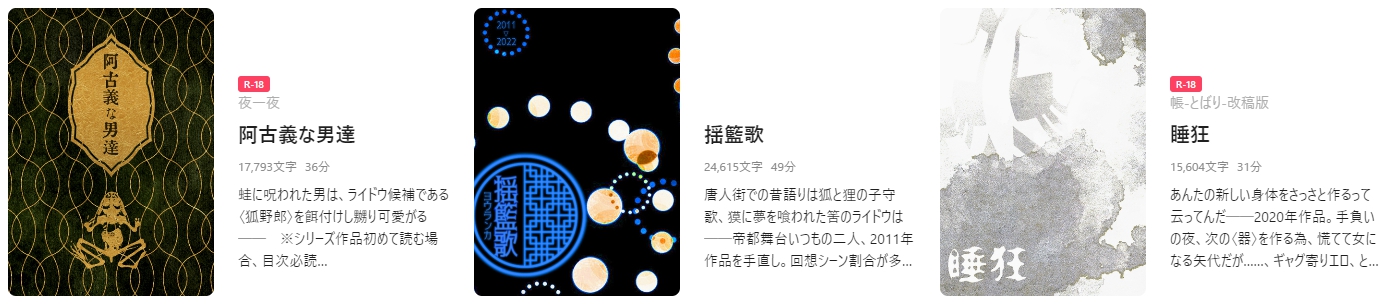 この「かつての主人」は当時から浮かんでいるが、詳しく書く予定は無い。キリが無い、広げようと思えば恐らくどこまでも書ける。モブとして出してきた里の面々、御上たち、谷の候補生時代だとか、蝦蟇や狸(リー)の家系、霊酒つくよみの酒蔵を造った過程、風間刑事の部下二名(擬態彦兄弟)、帳の下里や旅行先の人々……