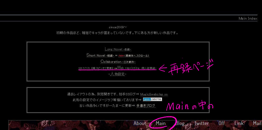 そうそう、Web拍手SS置き場がブラウザの関係か崩れてるので、今度改めてページ作ります。昔のページ構成のままで読みづらさもありましたしね。