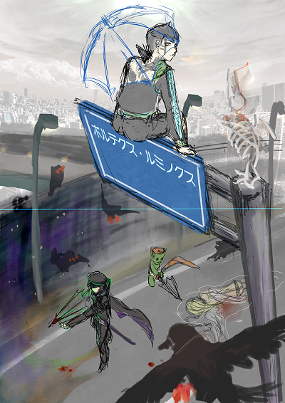 ごちゃっと感がありますが、着彩で調整していくつもりです。題字も最後に改めて、クリアトナーで大きく入れます(標識に記述されたタイトルが、一応メイン)