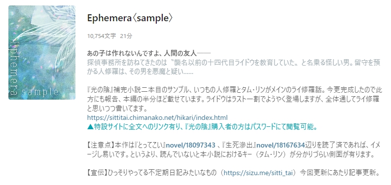 以前『かぎろひの陰』更新報告時に〝『Ephemera』はもっと短くなる〟といった事を述べていた気もしますが、なんと逆に長くなりました。